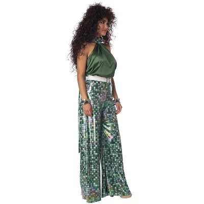 You’re going to be feeling some good vibes with this groovy 1970s costume. This Disco Lady Adult Costume features a beautiful green reversible halter top. One side features a far out geometric print while the other side is a solid forest green shade. The rest of this fab costume includes matching bell bottom pants and a white belt with silver ring buckle.
