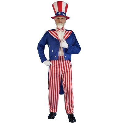 - USA! USA! USA! This great Uncle Sam costume includes: Blue jacket with tails, Red & White lapels, and White buttons, Red & White striped pants & tie and matching Uncle Sam hat. Shirt, Gloves & Beard not included.