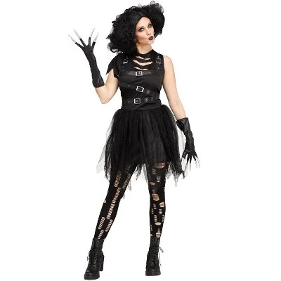 Go a little more gothic with your look this year with this Cut-Up Girl Costume for women. This dark outfit features a tattered black dress with multiple faux leather chest belts and buckles so that you can give Edward Scissorhands a run for his money!