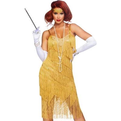 - Gold shimmer fringed dress; Headband; Gloves, cigarette holder, and jewelry not included
