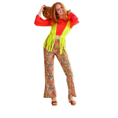 Celebrate the holidays in characteristic style this year. Feel the groove in this brightly-hued women’s hippie pants and shirt combo. It will be your go-to outfit for Halloween or any costume party.Product Features:Women’s hippie adult costumePaisley pants patternBright orange under shirt is attached to a bright yellow vest with a fringed bottomBelly baring topPerfect for Halloween and other themed parties2-Piece set includes:Women’s ShirtBell bottom pantsSizing Measurements:Women’s Size: Extra LargeWomen’s US Pant Size: 10-12Chest: 41.5″- 43″Material(s): polyester/spandexNote: does not include shoes